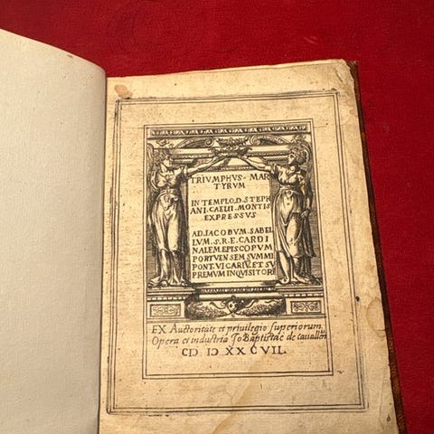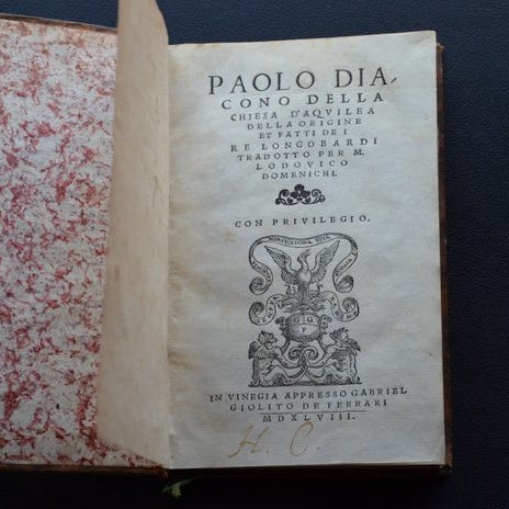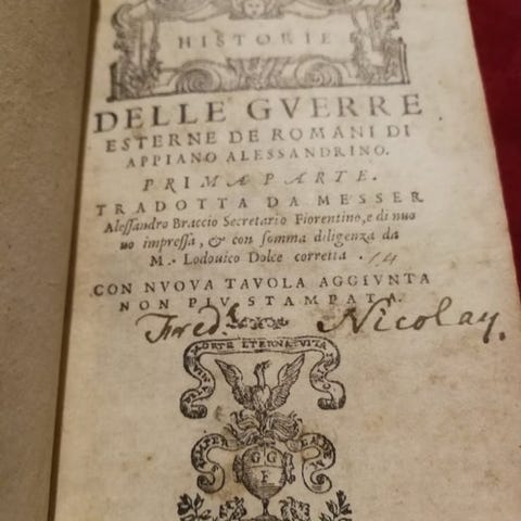Den genvindte Kors. Heroisk digt af Francesco Bracciolini. Bøger XXXV. Til Den Serenissimo Store Hertug af Toscana, Cosimo II. Venezia-udgaven fra 1611 trykt af Giunti i samarbejde med G.B. Ciotti. in-4, solid binding i fuld pergament; frontispice med trykmærke der afbildet Allegoria della Toscana (en kvindelig figur kronet mellem Arno og løven), initialer i træsnit og finali fint indgraverede. Et bord uden for teksten med kors og et anagram. Interiøret velholdt med digtsamfundets emner indrammet i elegante træsnitrammer.
