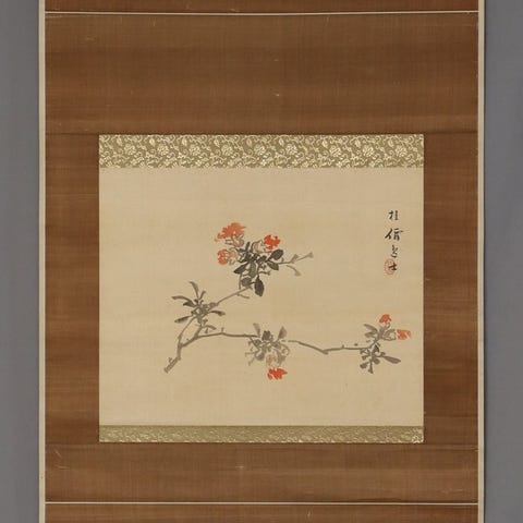Værkt søjle i silke fra Shōwa-perioden af Hosotani Tatsuzō (1906–?), med titlen Pomegranate and Small Bird og underskrevet Tōkō 東紅, japanske pigmenter på silke, måler 187,3 cm × 45,7 cm, i fair stand. Klik på den blå "gå til varen" knap, for at købe eller byde på denne vare. Den samlede pris vil blive vist inden du afgiver dit bud.
