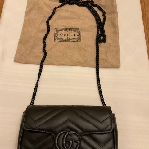 Gucci Go tas i sort læder og canvas med lysgullige metaldele, med aftagelig læderrem og kæde-rem til skulder- eller crossbody-brug, måler 22 x 12 x 9 cm, følger med dust bag og står som ny med ægthedscode 828761 650815. Klik på den blå "gå til varen" knap, for at købe eller byde på denne vare. Den samlede pris vil blive vist inden du afgiver dit bud.