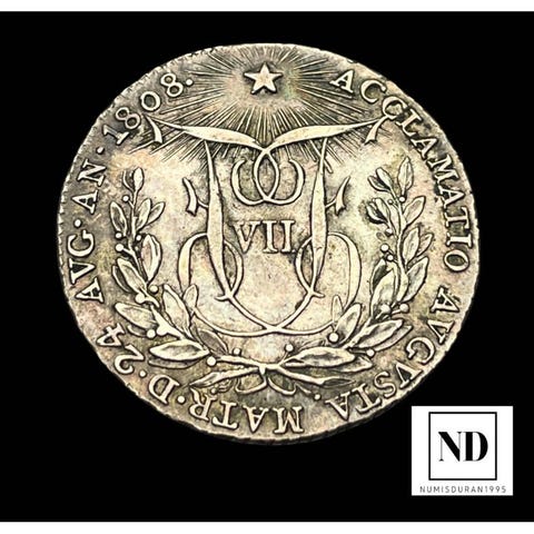 Medaljen støbt i hvidt metal til minde om det officielle besøg af Reina-Regente María Cristina de Borbón, ledsaget af sin datter, dronning Isabel II, til Monnaie de Paris den 4. december 1840. Aversen viser de vendte og overlappende busts af María Cristina og Isabel II, der vender mod højre, med en cirkulær