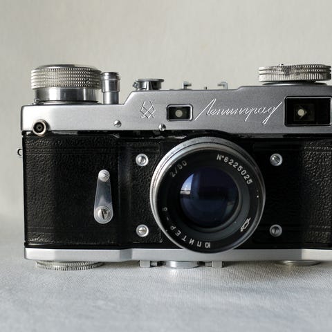 Tidligt Sovjet-FED 35 mm rangefinder-kamera, indgraveret "Завод им. ФЭ Дзержинского", oversat som "Fabrik opkaldt efter F. E. Dzerzhinsky".