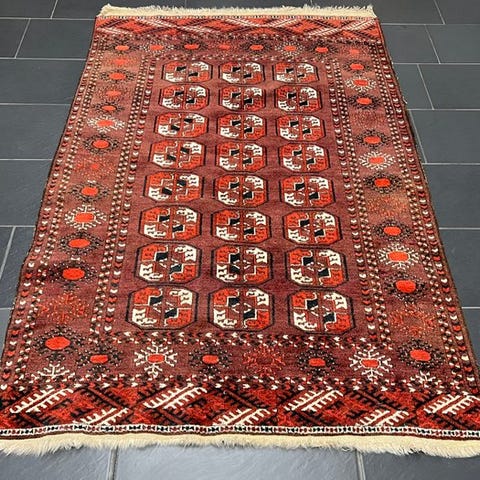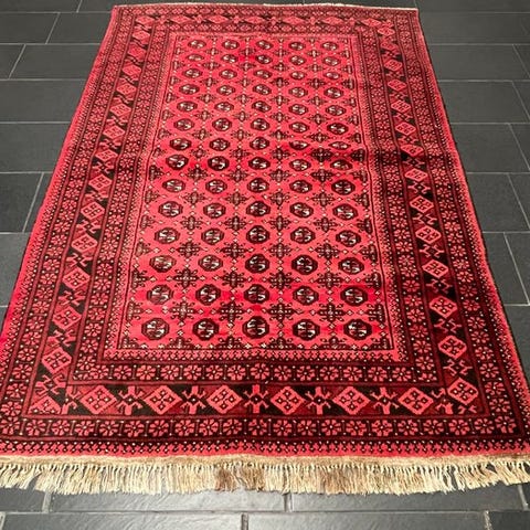 Afghansk håndvævet tæppe, model UDSSR Jomut Afghan, målene 170 x 135 cm, uld på bomuld, i god stand med alders- og brugsspor. Klik på den blå "gå til varen" knap, for at købe eller byde på denne vare. Den samlede pris vil blive vist inden du afgiver dit bud.