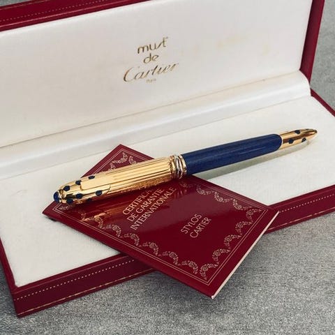 Pasha de Cartier kuglepen med guldbelagt sammensat krop og cabochon af rød resin, 14,7 cm lang, 1 cm i diameter, oprindelse Italien, Periode Fin XX. århundrede, i meget god brugt stand og i funktion. Klik på den blå "gå til varen" knap, for at købe eller byde på denne vare. Den samlede pris vil blive vist inden du afgiver dit bud.