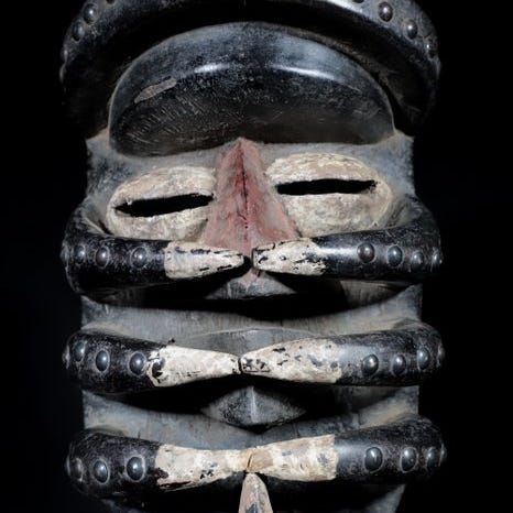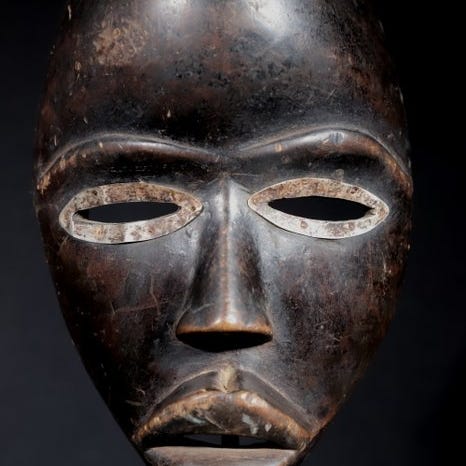 Imponerende ansigt til denne maske, udskåret i ét stykke træ.