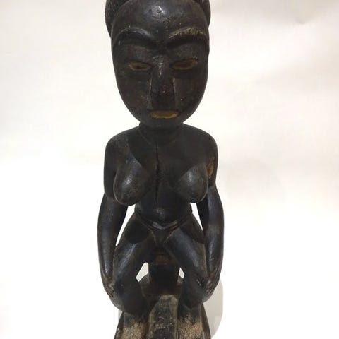 Smukke par af Baoulé-spådomsstatuer fra Côte d'Ivoire. Det er et forfædrespar, de er i kontakt med de ældstes ånder. Det er denne særlige forbindelse til dødsriget og de synlige verdener, der muliggør spåkunsten. Statuerne er fint udskårne og dekorerede. Utvivlsomt er det et værk af en erfaren kunstner. Scarifikation pryder deres kroppe, ansigterne og hårbundene er særligt gennemarbejdede. Deres tilstedeværelse er stærk, blikket er gennemtrængende, ansigterne er lukkede, kroppens stilling er spændt. De er fuldstændigt koncentrerede og hengivne deres opgave. Patinen er pragtfuld og ældre. De