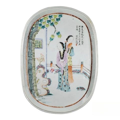 Porcelæns-trembleuse-bund i Qianlong-perioden (model “Mancerina” til det spanske marked) i muslingeform med Famille Rose-låg og rocaille-flores-relief; kop er mangler, bunden let slebet, små hak og en afsats på bagsiden, dimensioner 24,5 cm dyb, 23 cm bred, 4 cm høj. Klik på den blå "gå til varen" knap, for at købe eller byde på denne vare. Den samlede pris vil blive vist inden du afgiver dit bud.