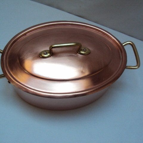 Stor kobbergryde med låg og håndtag af jern. Denne stegegryde vil hurtigt blive dit foretrukne køkkenredskab. Gryden er også et smukt dekorationsstykke, som du kan stille frem i dit køkken efter brug; der er nogle pletter indeni.