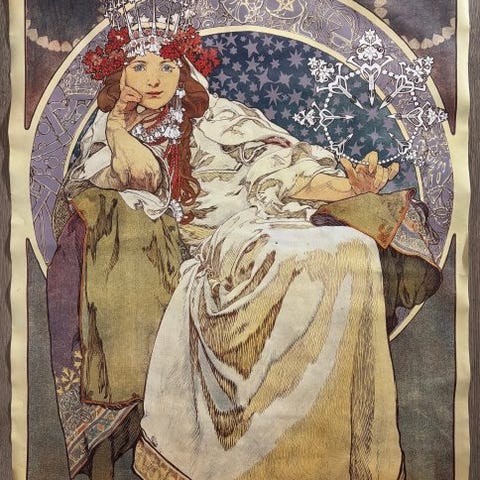 Værket skildrer en intens kvindelig figur, indhyllet i en hvid kjole med geometriske og lyse folder, og et blåt sjal, der fremhæver hendes sensualitet og formelle stringens. Den sofistikerede positur, det direkte blik og den skulpturelle præcision i detaljerne fortæller hele den æstetiske kraft af Art Déco.