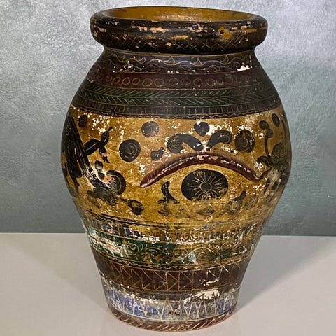 Motivet er i relief eller malet med en intens rød/orange farve på en fuldstændig forgyldt baggrund, der har en craquelé- eller sprækket finish. Forgyldningsteknikken og det klassiske motiv er typiske for italienske hellige kunst- eller samlerobjekter.