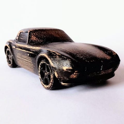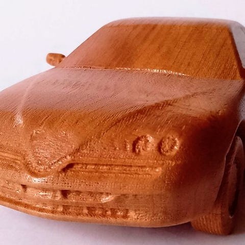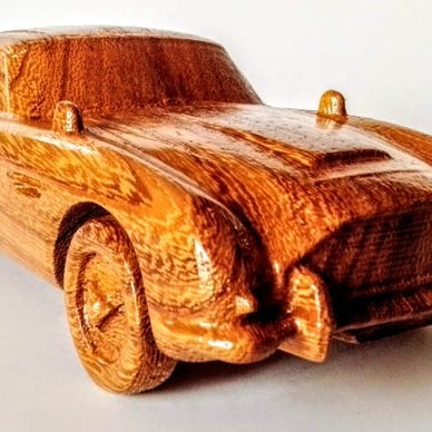 Fremstillet i valnøddetræ med naturlig oliefinish, modellen har karrosseri og hjul udskåret fra en enkelt blok i en håndværksmæssig bearbejdningsproces med stor præcision.