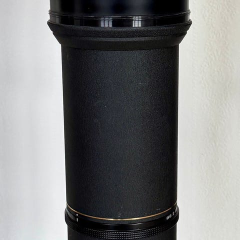 Sjælden 600 mm f/4 Nikon, i perfekt stand undtagen det beslag, der gør montering på stativ muligt. Givet objektivets vægt (6,4 kg) er det næsten umuligt at bruge det på anden måde end med stativ, deraf mærkningen på dette beslag.