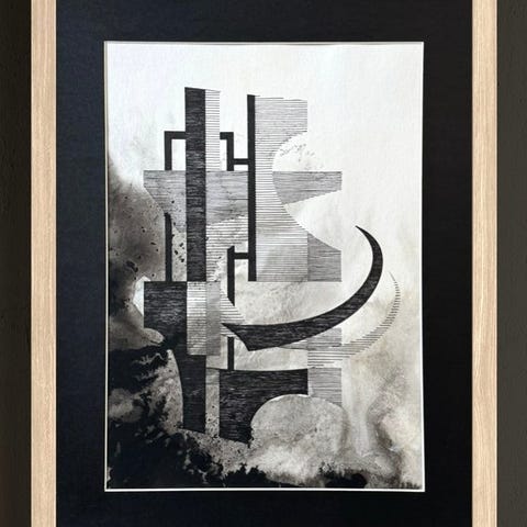 Kompositionen hviler på et stramt, geometrisk arrangement af slanke former, der artikulerer parallelle linjer, dyb sort og spændte kurver. Tegningen spiller på en markant kontrast mellem den dybe sort af blækket og de lyse områder i underlaget, forstærket af materiale- og spredningseffekter, som giver baggrunden