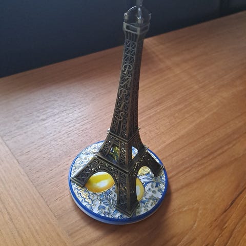 Giant metal Eiffel Tower med et smukt design, der har krøller, franske liljer og en stor 'Paris'-tekst øverst. Det vil se fantastisk ud med blomsterkasser på etagerne.