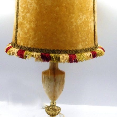 Alabastkalk/krukke i beige med detaljeret floralt mønster i form af en rose, rund fod, 32 cm høj, 18 cm bred og 18 cm dyb, vægt 4 kg, én E14-fatning til 220 V, maks. 40 W, elektriske elementer og ledninger fuldt fornyet, lampe medfølger; oprindelse Spanien; skønnet periode 1960–1970; i god stand med mindre aldersrelaterede brugsspor. Klik på den blå "gå til varen" knap, for at købe eller byde på denne vare. Den samlede pris vil blive vist inden du afgiver dit bud.