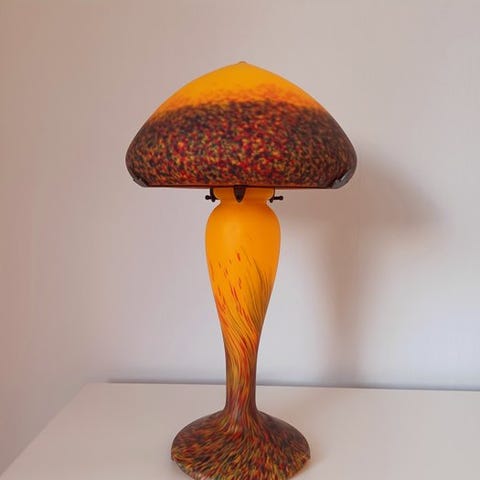 Vianne lampe af mundblæst glas, håndlavet i Frankrig (Lot-et-Garonne) ca. 1980–1990, orange opal glas, separat tænd/sluk for fod og skærm, kræver to pærer; god stand med mindre brugsspor og i funktion. Klik på den blå "gå til varen" knap, for at købe eller byde på denne vare. Den samlede pris vil blive vist inden du afgiver dit bud.