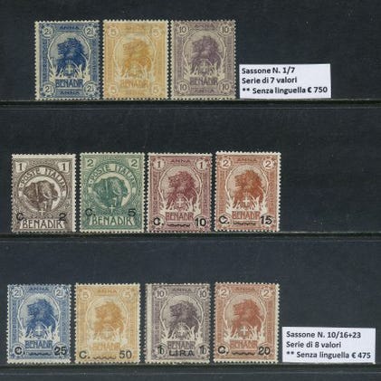 Oprindelse: Somalia italiana. Titel: Segnatasse med overtryk øverst. Komplet serie på 11 værdier Sassone T12/22, mint uden språk og certificeret. Klik på den blå "gå til varen" knap, for at købe eller byde på denne vare. Den samlede pris vil blive vist inden du afgiver dit bud.