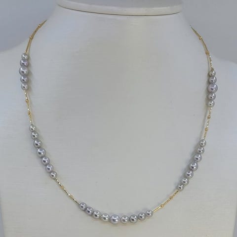 En smuk perlekæde blandet med hvide, sølvfarvede og champagneguld akoya-perler. Akoya-perlen er en type kultiveret saltvandsperle, der stammer fra Japan.