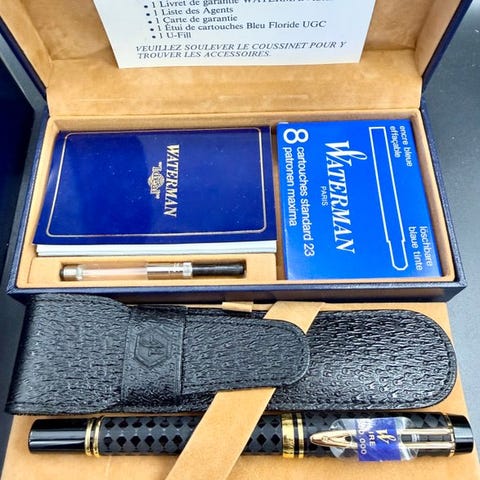 W. A. Sheaffer Commemorative-fountainpen, begrænset til 6.000 enheder (nr. 0490), fremstillet i USA, med 14K guldnib og legert guldbelagt messingkrop, 13 cm lang, løftefyldning, to-tone 18K-nib mærket X, udgivet i 1996, inklusive original præsentationsæske, ægthedscertifikat og blækflaske til tests. Klik på den blå "gå til varen" knap, for at købe eller byde på denne vare. Den samlede pris vil blive vist inden du afgiver dit bud.