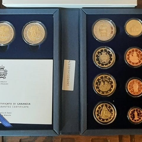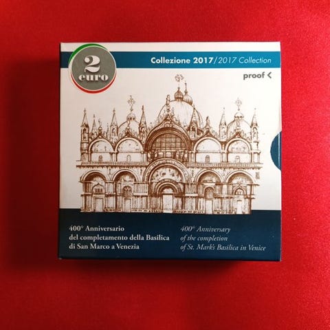 San Marino 2017 divisionale Fondo Specchio (Proof) med 10 proof mønter, herunder to 2-euro erindringsmønter til Giottos 750-års fødselsdag og International Year of Sustainable Tourism, med original ydre kasse, intern fast kasse og ægthedscertifikat, tryk 2.600 sæt, UNC, vægt 500 g. Klik på den blå "gå til varen" knap, for at købe eller byde på denne vare. Den samlede pris vil blive vist inden du afgiver dit bud.