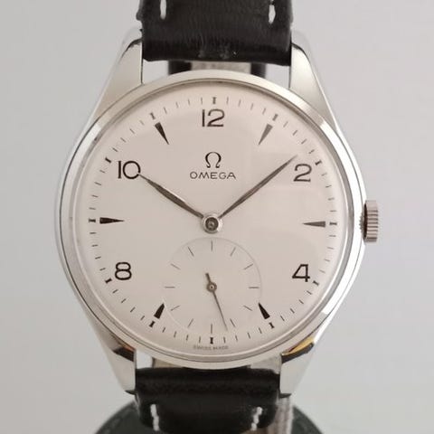 Omega Honeycomb Jumbo reference 2503, år 1965, herreur med manuelt optræk, 36 mm guldbelagt kasse, sort skive restaureret, krone ikke original, læderrem, tilstand god med synlige brugsspor. Klik på den blå "gå til varen" knap, for at købe eller byde på denne vare. Den samlede pris vil blive vist inden du afgiver dit bud.