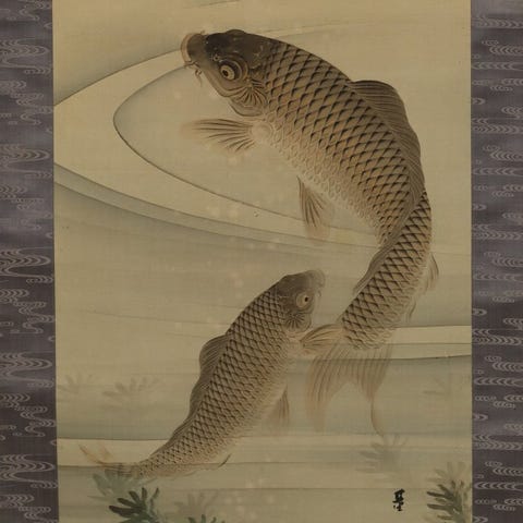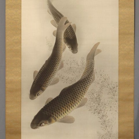 En enkelt japansk hængelod af Okamoto Toyohiko (1773–1845) fra sen-edo-perioden, kaldet Carp, With signature Toyohiko, på blæk og lyse pigmenter på papir med en silkeophængning; samlet højdemål 123,5 cm og bredde 27,5 cm (billedet 41,7 cm × 25,7 cm); oprindelse Japan; stand: fair med forbrændinger, pletter og rynker på papiret og billedet, spændingsforvredning og flere årtiers omramning. Klik på den blå "gå til varen" knap, for at købe eller byde på denne vare. Den samlede pris vil blive vist inden du afgiver dit bud.