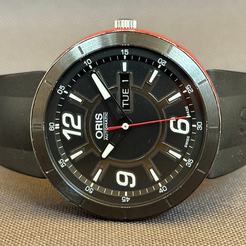 Skive: Sort. Kalender ved klokken 6. Lysbærende visere. Lille sekundviser ved klokken 6.