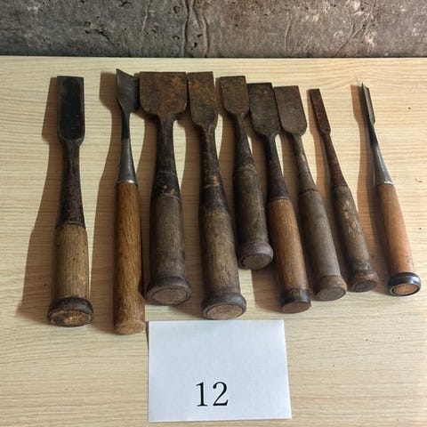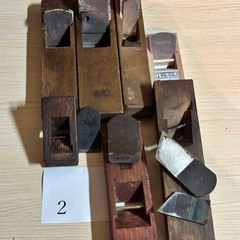Dette mangfoldige parti (Lot #10) byder på en samling af 8 vintage japanske håndværktøjer, der spænder fra snedkerjern til specialiserede kuttere og skrapere. Dette sæt er særligt ved dets inkludering af ikke-standard snedkerredskaber, hvilket gør det til en fascinerende opdagelse for samlere af bredt japansk håndværk.