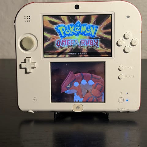 Smuk Nintendo 2DS-konsol, Pokémon Red-udgave, gennemsigtig.