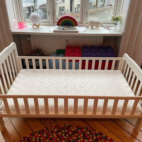 Mærke ukendt. Retro børneseng, med tilhørende vanger således at sengen kan forlænges fra 160 til 200 cm. Madrassen er 2 år gammel og her medfølger også forlængerstykke op til 2 meter. Der er ligeledes nyere lamelbund med til sengen, og der er god plads til opbevaring under sengen.