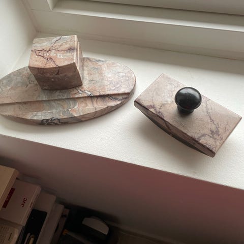Meget gammel pennebakke med blækhus, trækpapirsuger samt træbrevåbner. Delene er ikke ens.