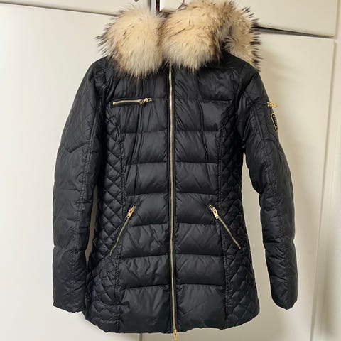 Lækker, praktisk dunjakke med smukke detaljer. Jakken er i kraftigt nylon med vindfang i ærmer og en masse gode lommer med lynlås - både udvendig og indvendig. Figursyet snit med hætte, der er foret og kantet med pels. Aftagelig hætte og pels. Fyld 70 % dun 30 % fjer. Almindelig i størrelsen.