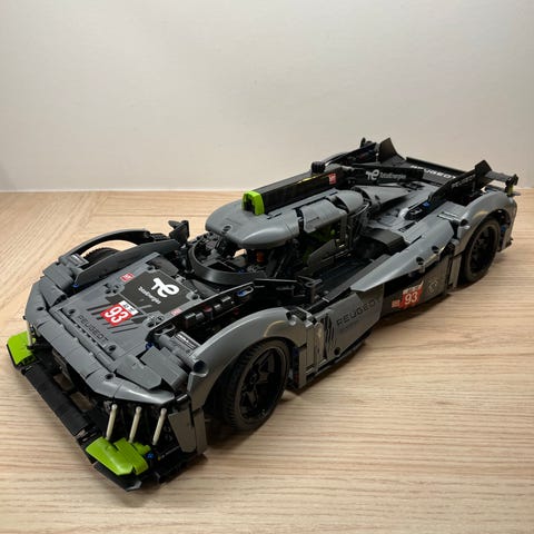 LEGO Technic bil model i blå med hvide striber. Modellen er lavet af plastik og er en del af LEGO Technic-serien, der fokuserer på detaljerede og funktionelle køretøjer.