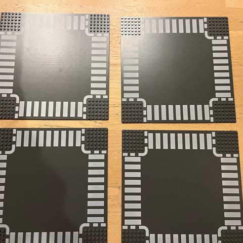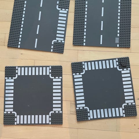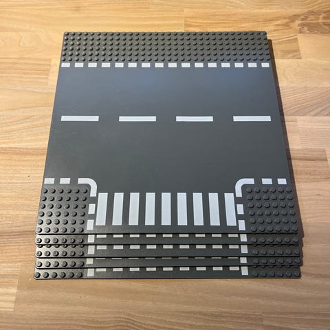 LEGO City vejplader i sort med hvide vejstriber og kantmarkeringer. Pladerne er designet til at kunne forbindes med andre LEGO-klodser og bruges til at bygge veje i LEGO-byer.