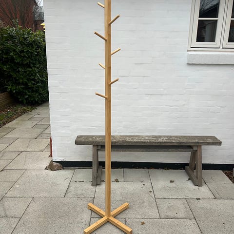 Jysk stumtjener i træ med flere knager til ophængning af tøj eller tilbehør. Designet til at stå på gulvet og give praktisk opbevaring i entré eller andre rum.