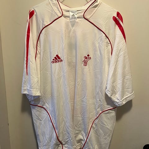 Rigtig pæn blå bluse med korte ærmer, har hvide Adidas striber over skuldre og ærmer