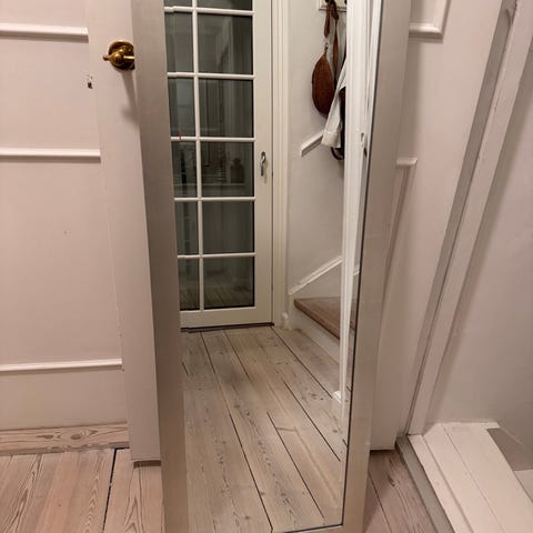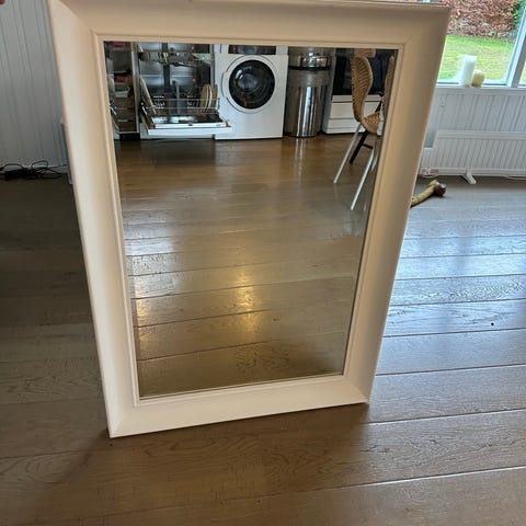 IKEA spejl med bred ramme i beige farve. Spejlet har et dekorativt mønster på rammen og er velegnet til ophængning i hjemmet. Mål 90x130
