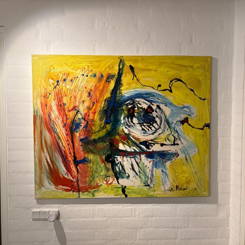 Et fedt abstrakt maleri med de meget tidstypiske J.V Martin farver. Et frisk pust som passer rigtig godt ind i de fleste moderne hjem. Maleriet er fejlfrit.