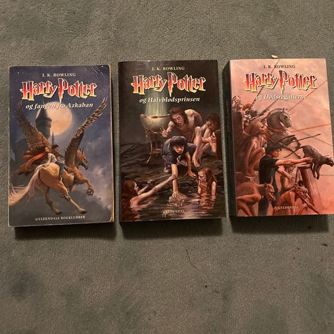 J.K. Rowling Harry Potter bogserie bestående af flere bind med illustrationer på forsiderne. Bøgerne omfatter titlerne Harry Potter og Fangen fra Azkaban, Harry Potter og Hemmelighedernes Kammer, og Harry Potter og Flammernes Pokal.