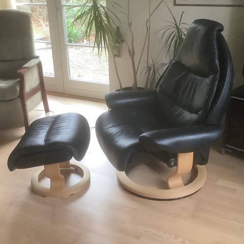 Lækker ‘ægte’ Stressless Voyager lænestol og tilhørende praktisk skammel.