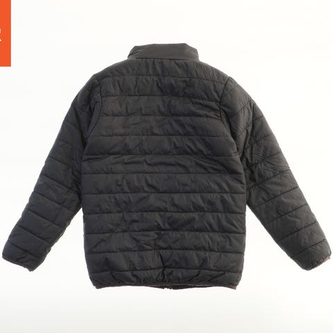 Jakke i sort farve, designet med polstring og vandret quilting. Den har en lynlåslukning og lange ærmer. Velegnet til kolde vejrforhold.