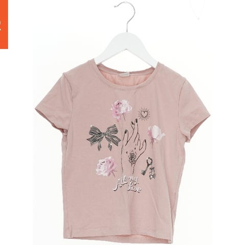 T-shirt med korte ærmer. Den har et print af hvide og lyserøde enhjørninger samt regnbuer og skyer over hele stoffet. Kanten af ærmerne og nederst er bølgekantet.