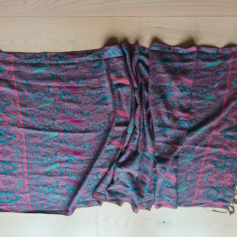 Tørklæde lavet af en blanding af pashmina og silke. Det har et flot blomstermønster i den ene ende og frynser i begge ender. Størrelsen er 73x162 cm, hvilket gør det velegnet til at vikle om halsen eller som en dekorativ accessory. Materialet ser blødt og komfortabelt ud.