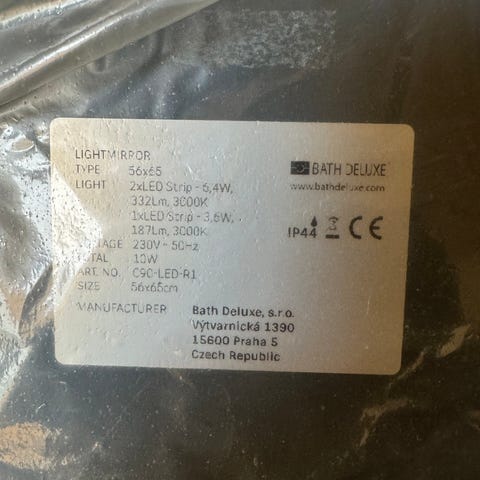 Spejl med oval form og integreret LED-belysning. Spejlet har touchknapper til justering af lys og varmefunktion.