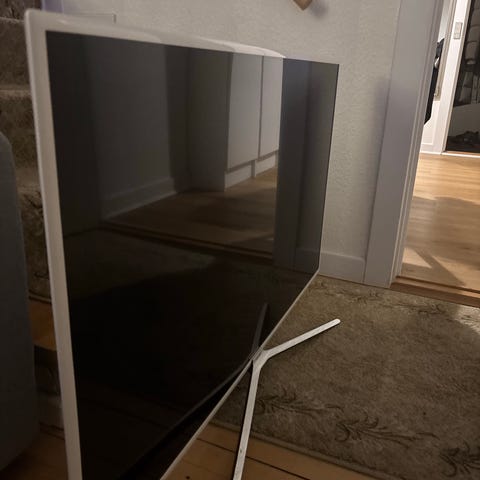 Samsung TV med skærm og fjernbetjening. Produktet er sort. 55 tommer
