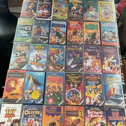 Samling af Disney VHS film med forskellige titler. Filmene er i standard VHS kassetteformat og indeholder klassiske Disney historier. Velegnet til samlere og nostalgiske filmfans.