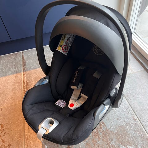 Autostolen kan ligges ned, når den ikke er i bilen. Meget smart, til hvis baby falder i søvn og lige skal sove lidt videre. Autostolen er brugt, men stadig i fin stand. Der er et lille hul i kalechen bag ved (se billede) babyindsatsen er den sorte pude, som skal bruges imens baby er helt nyfødt.