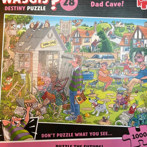 Wasgij Destiny puslespil med 1000 brikker. Puslespillet har et tegneserieagtigt motiv med personer, der spiller skak og socialiserer i et rum fyldt med detaljer. Puslespillet udfordrer brugeren til at tænke kreativt og uden for boksen.