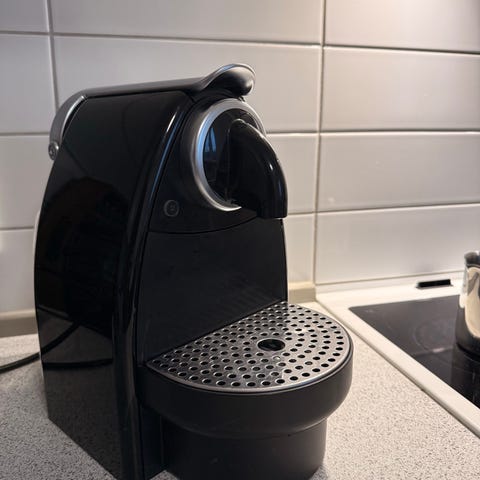 Nespresso kaffemaskine i sort farve. Designet til at brygge espresso ved brug af Nespresso kapsler. Kompakt størrelse, velegnet til hjemmebrug eller små kontorer.
