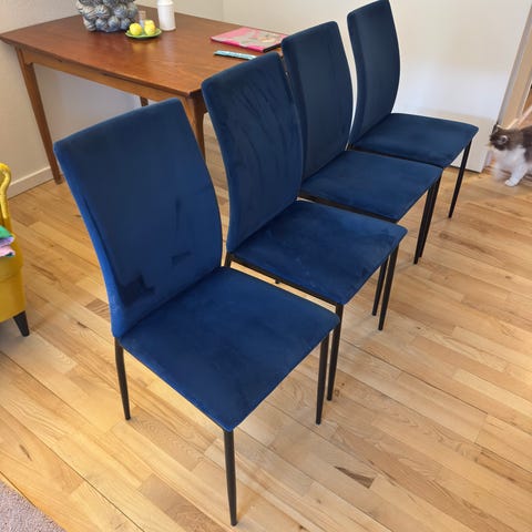 Stole i flot blåt betræk, stabile og behagelige. Har 3 stk. sælger for 150 pr stk.