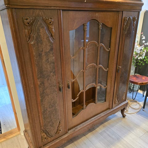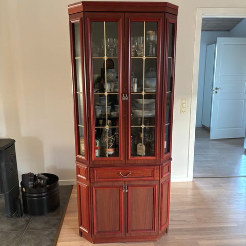 Reol med vitrine med lys i. Dybde 38. Længde 222,5. Højde 184. Uden indhold